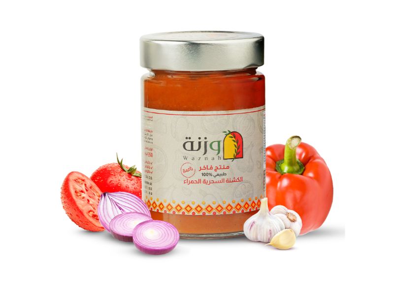بصل أحمر - طماطم طازج -فلفل أحمر بارد - ثوم - زنجبيل - معجون طماطم -زيت الكانولا - خل - سكر - ملح - دبس رمان - عصير ليمون طبيعي - بهارات وزنة المشكلة .